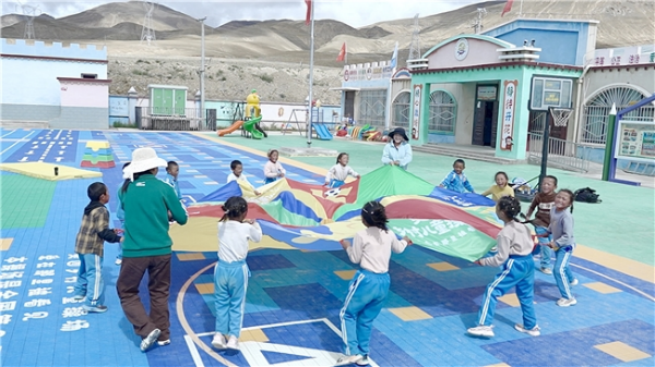 西藏自治区日喀则市定日县岗嘎镇查孜村幼儿园,小朋友在村庄儿童操场上进行游戏。图为受访者供图