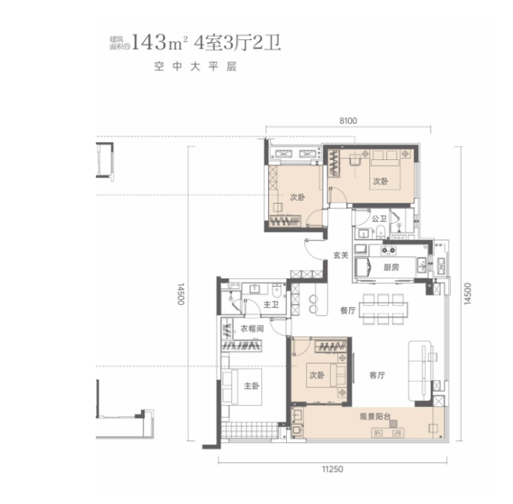 高端四居室户型专为追求高品质便捷生活的家庭设计,在空间尺度和功能配置上都达到了较高水准。户型采用大面宽、短进深的设计,最大化引入自然光线,让室内每一个空间都能享受到充足的采光和良好的通风。客厅挑高搭配超大观景落地窗,视野开阔,气势恢宏,同时客厅与餐厅、厨房形成流畅的动线布局,公共活动区域开阔通透,能够很好的满足家庭大型聚餐、高端接待等场景需求。